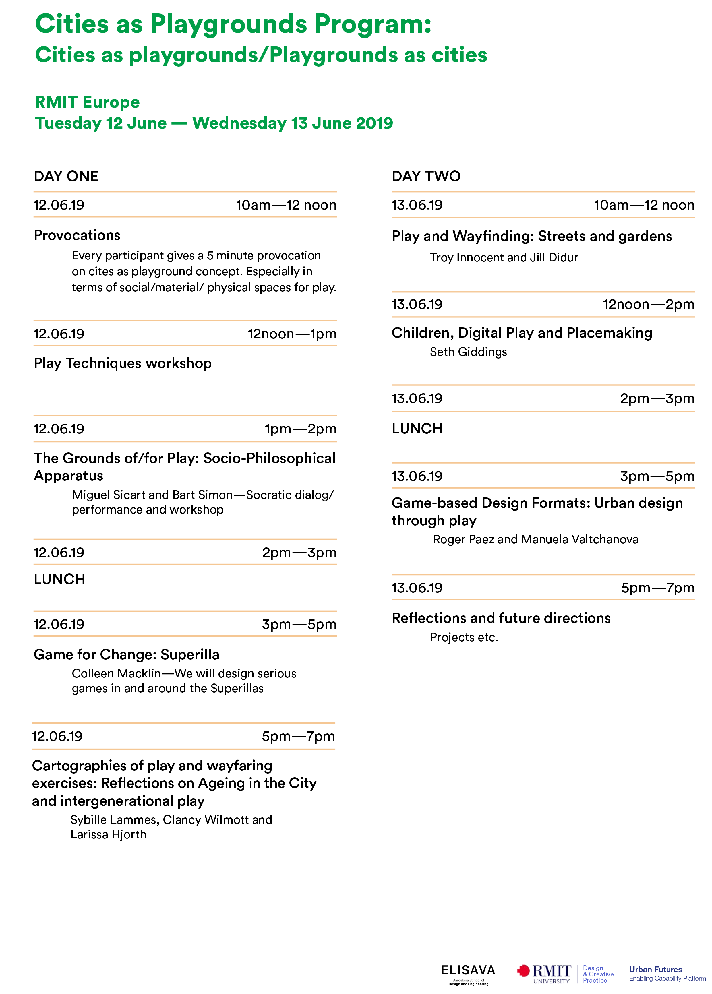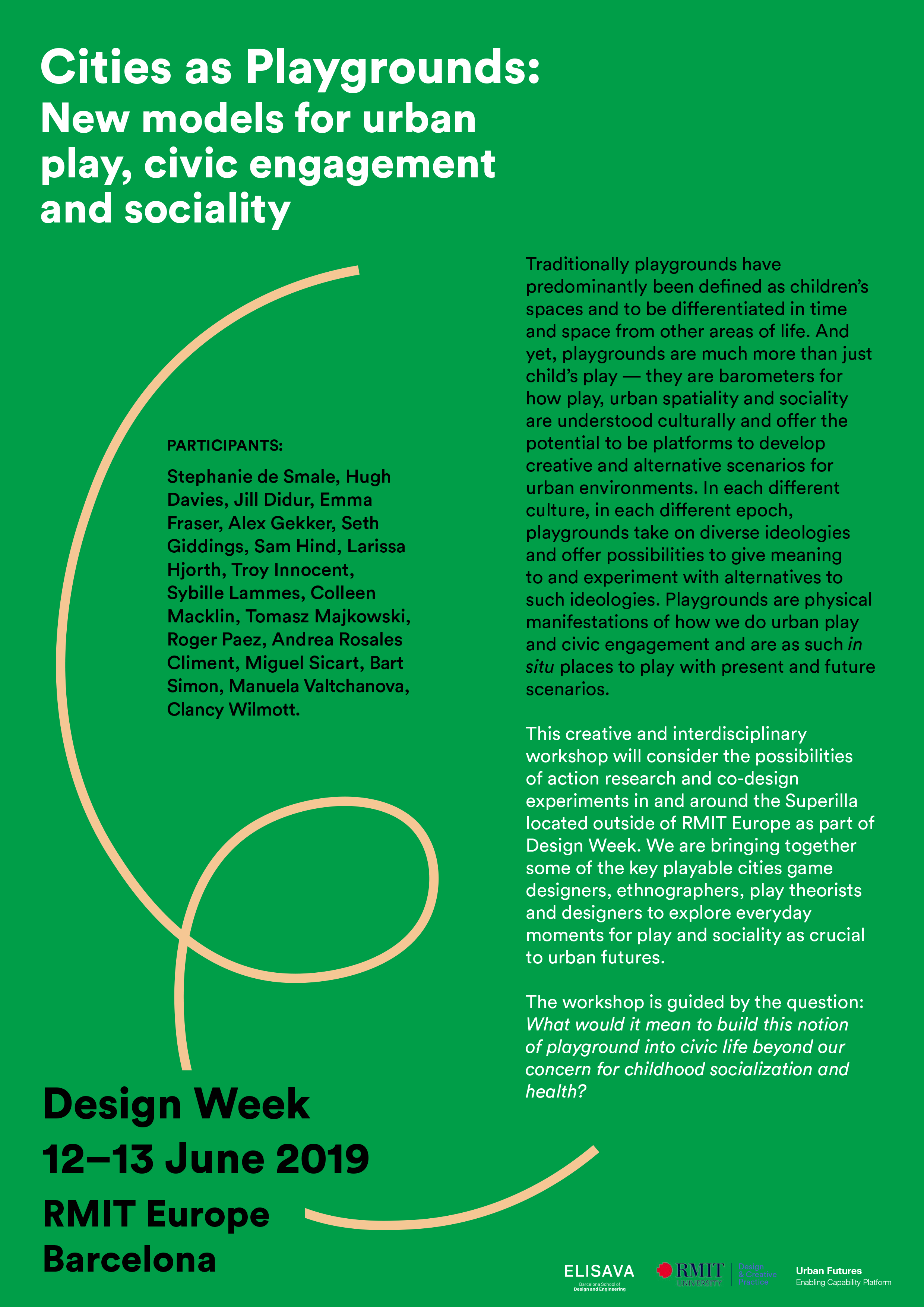 This creative and interdisciplinary workshop will consider the possibilities of action research and co-design experiments in and around the Superilla located outside of RMIT Europe as part of Design Week. We are bringing together some of the key playable cities game designers, ethnographers, play theorists and designers to explore everyday moments for play and sociality as crucial to urban futures.